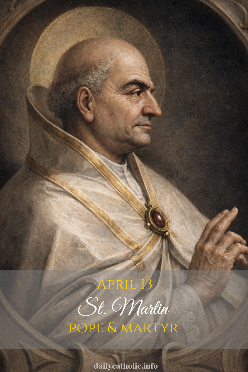 St. Martin was a priest of Rome who had a reputation for being well-educated and holy. He became pope in July, 649. When people were arguing over the truths about Jesus, Pope Martin called a meeting of bishops. This meeting was the Council of the Lateran. It explained clearly what we believe about certain truths. However, some Christians were not pleased about it. Pope Martin knew the Council's explanations were true. It was his duty as pope to teach people the truth.
